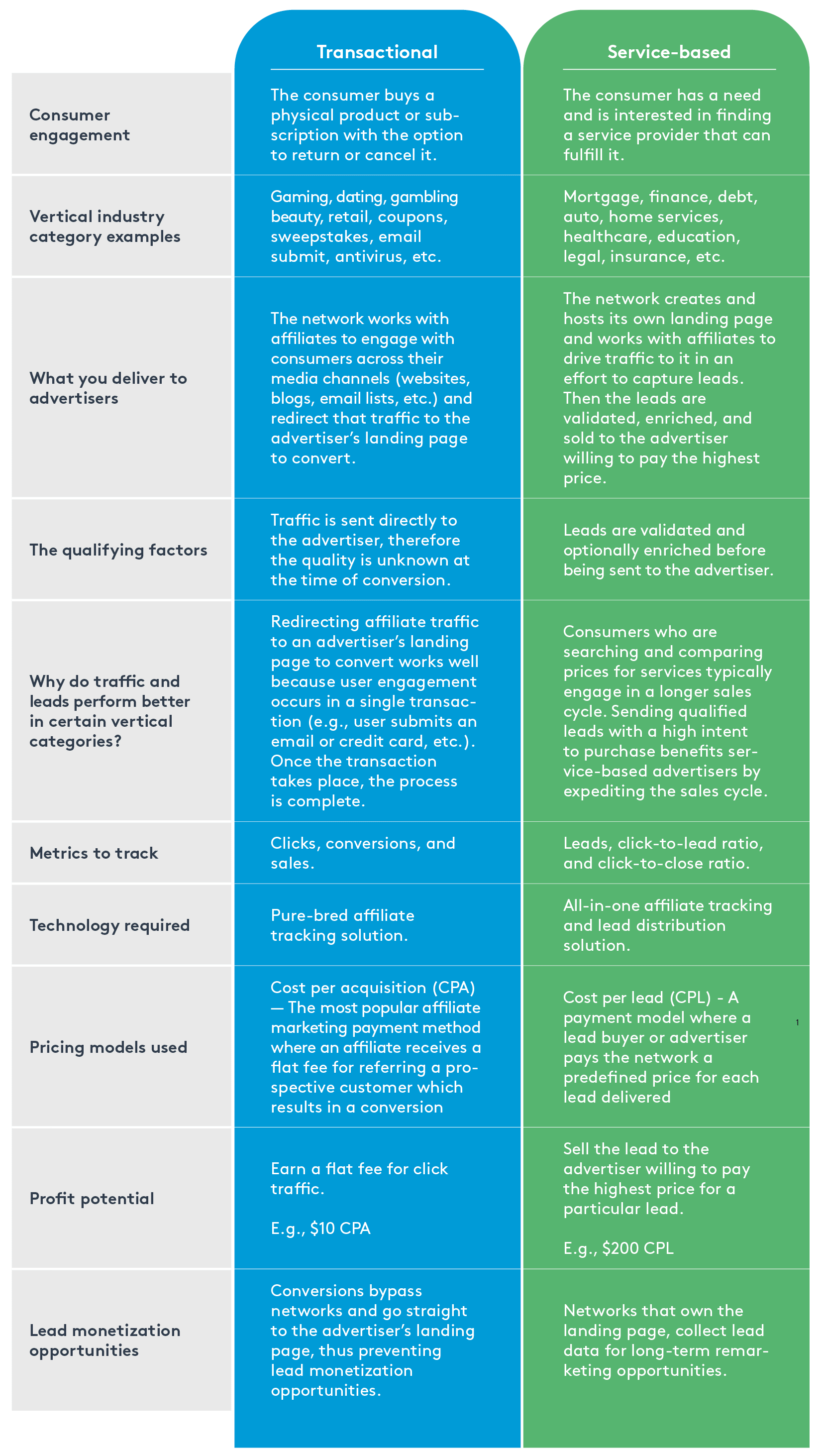 Every vertical industry falls into one of two categories – Transactional or service-based. What sets the categories apart are the technologies used, the methods of consumer engagement, how tracking workflows are managed, the value delivered to advertisers, and most importantly the profit potential.