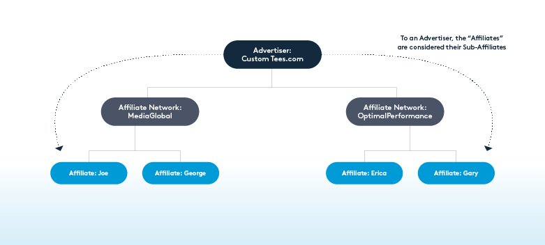Advertisers and affiliate networks work with affiliates, and those affiliates have partners of their own, called sub-affiliates.