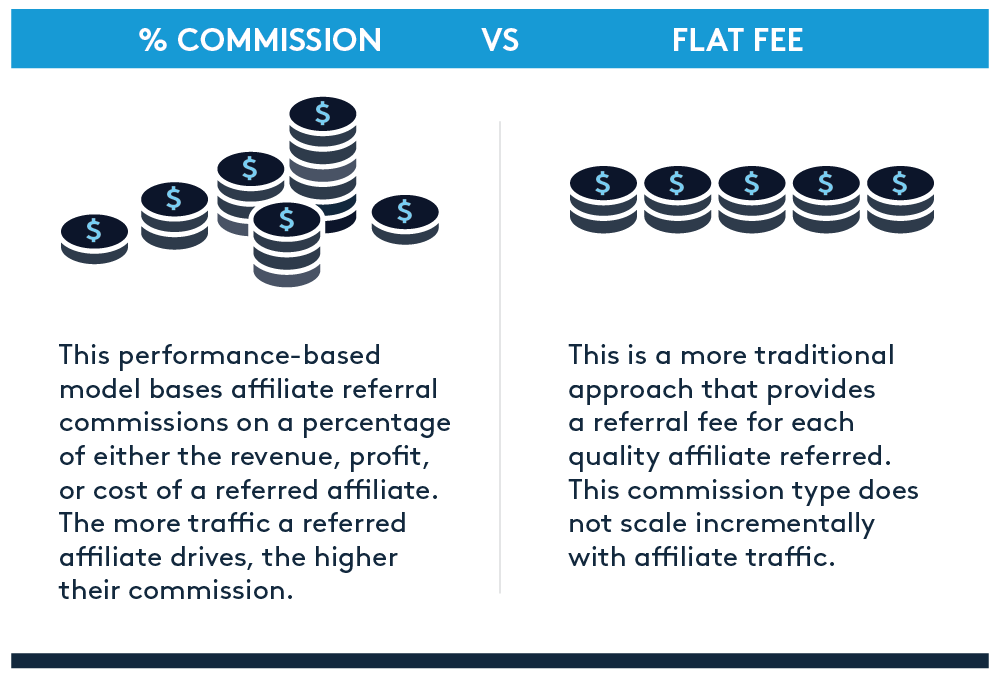 Commissions are either a percentage or a flat fee, based on revenue, cost, or profit depending on what makes the most sense for your business. They can also be based on the quality of an affiliate’s traffic or their tenure with your affiliate program.